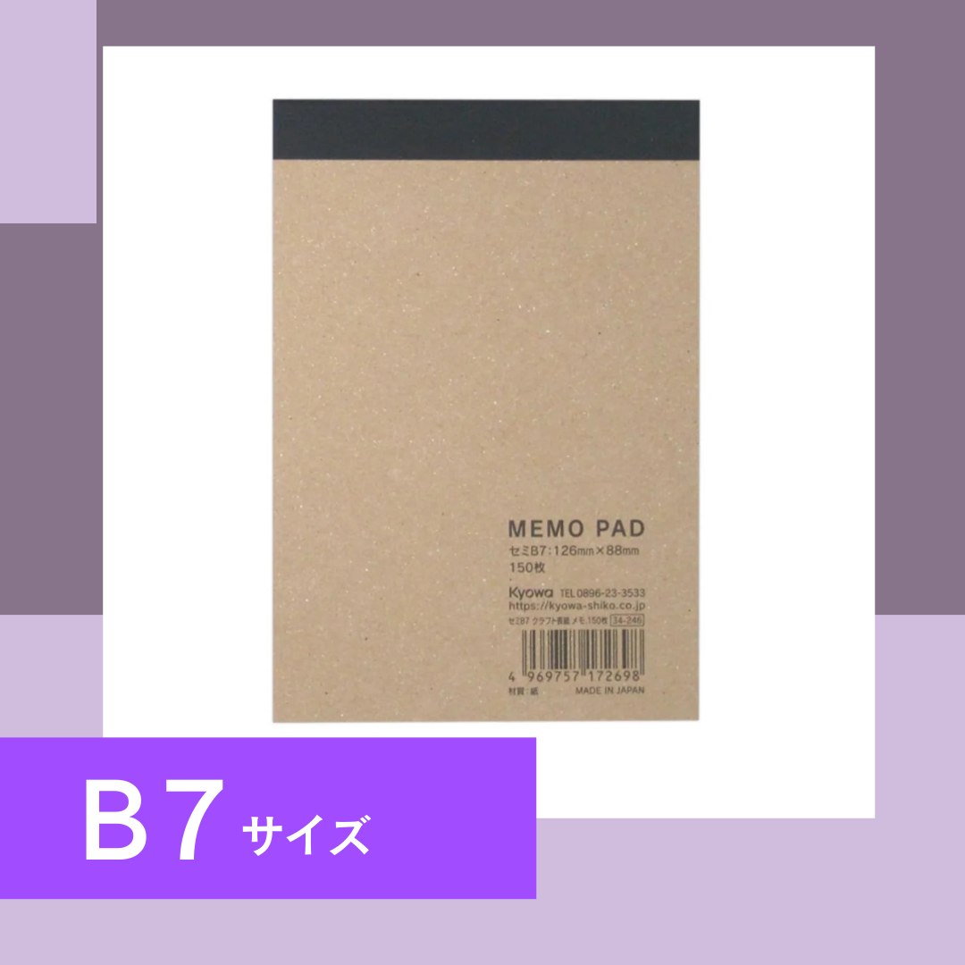 コンパクトなB7サイズで、ポケットにもすっきり収まるクラフト表紙のメモ帳。ナチュラルな風合いのクラフト表紙は丈夫でシンプル。150枚入りの大容量仕様なので、思いついたアイデアや買い物リスト、外出先でのメモなど、毎日気軽にたっぷり使えます。持ち運びやすく、ビジネスや学習、プライベートなど幅広いシーンで活躍します。